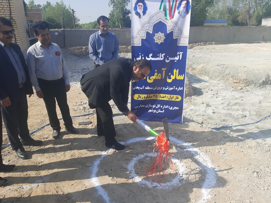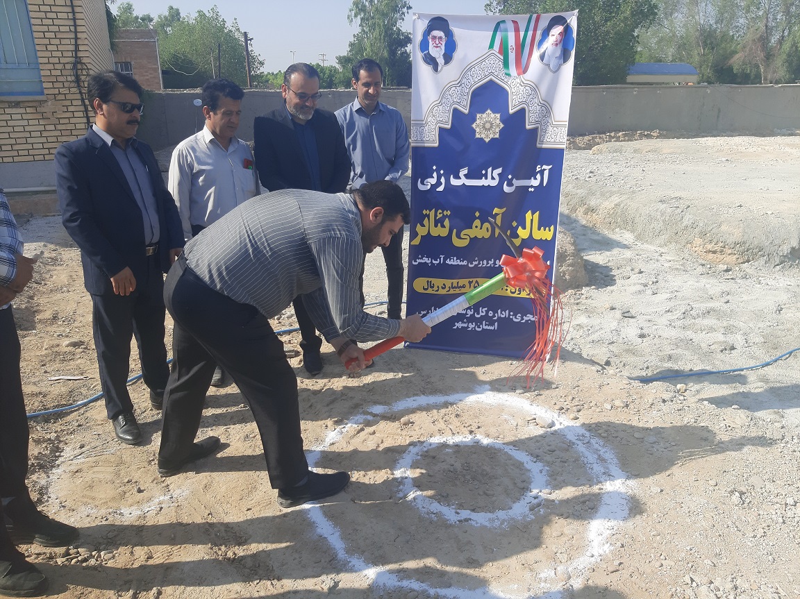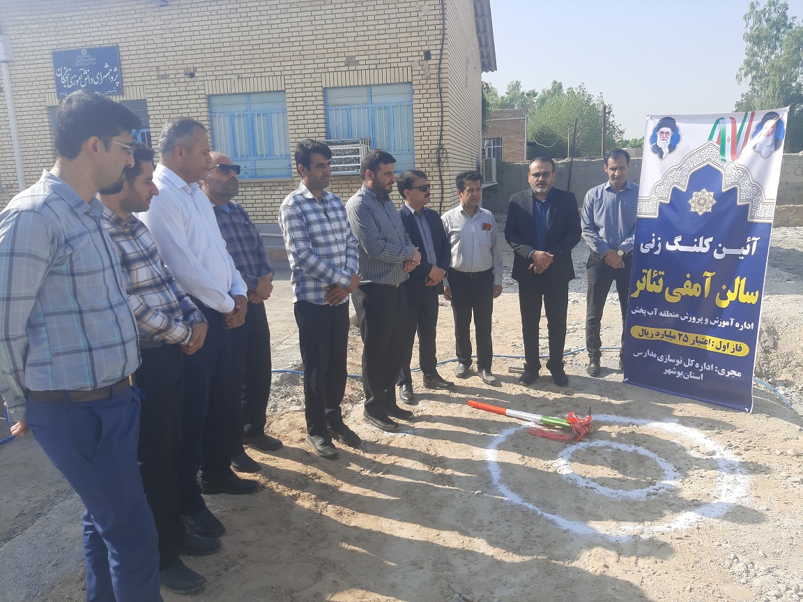 در چهارمین روز از هفته دولت، فاز اول پروژه احداث سالن آمفی تئاتر اداره آموزش و پرورش منطقه آب پخش با اعتبار 25 میلیارد ریال با حضور مسئولان بخش و شهر کلنگ زنی شد.
