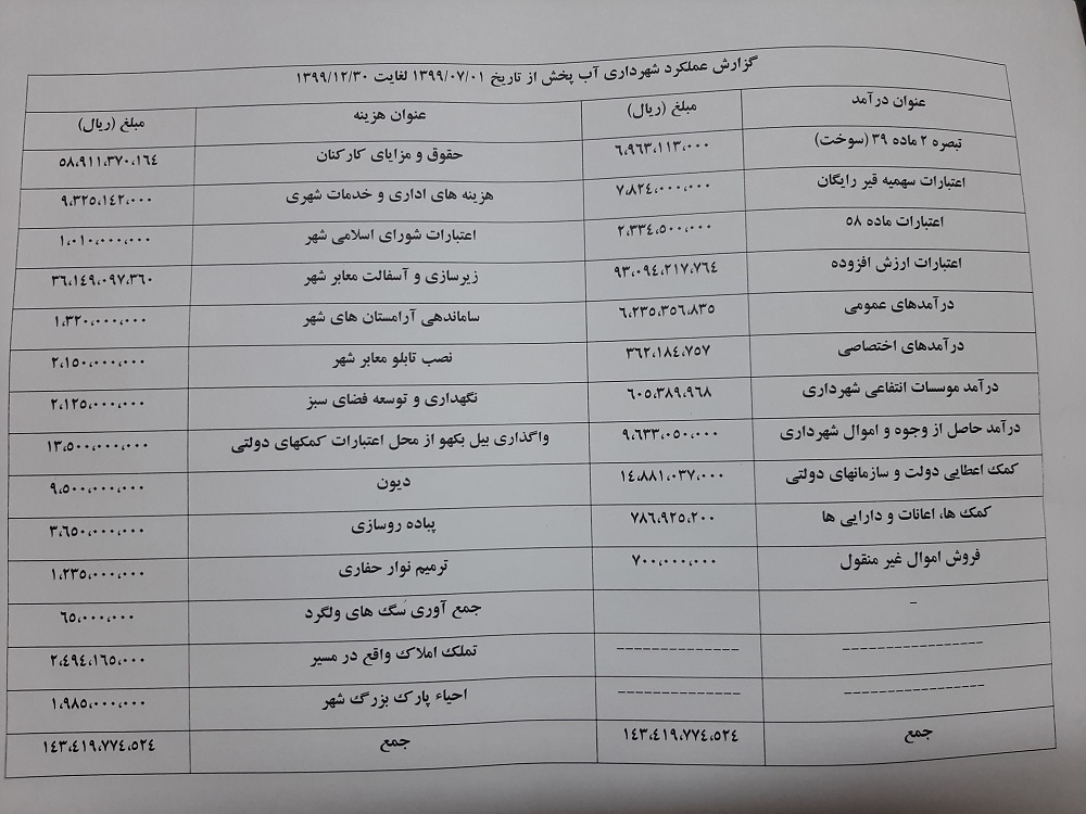 رضایی عملکرد درآمدی و هزینه ای شهرداری آب پخش در شش ماهه دوم سال 99 را به شرح زیر اعلام کرد؛